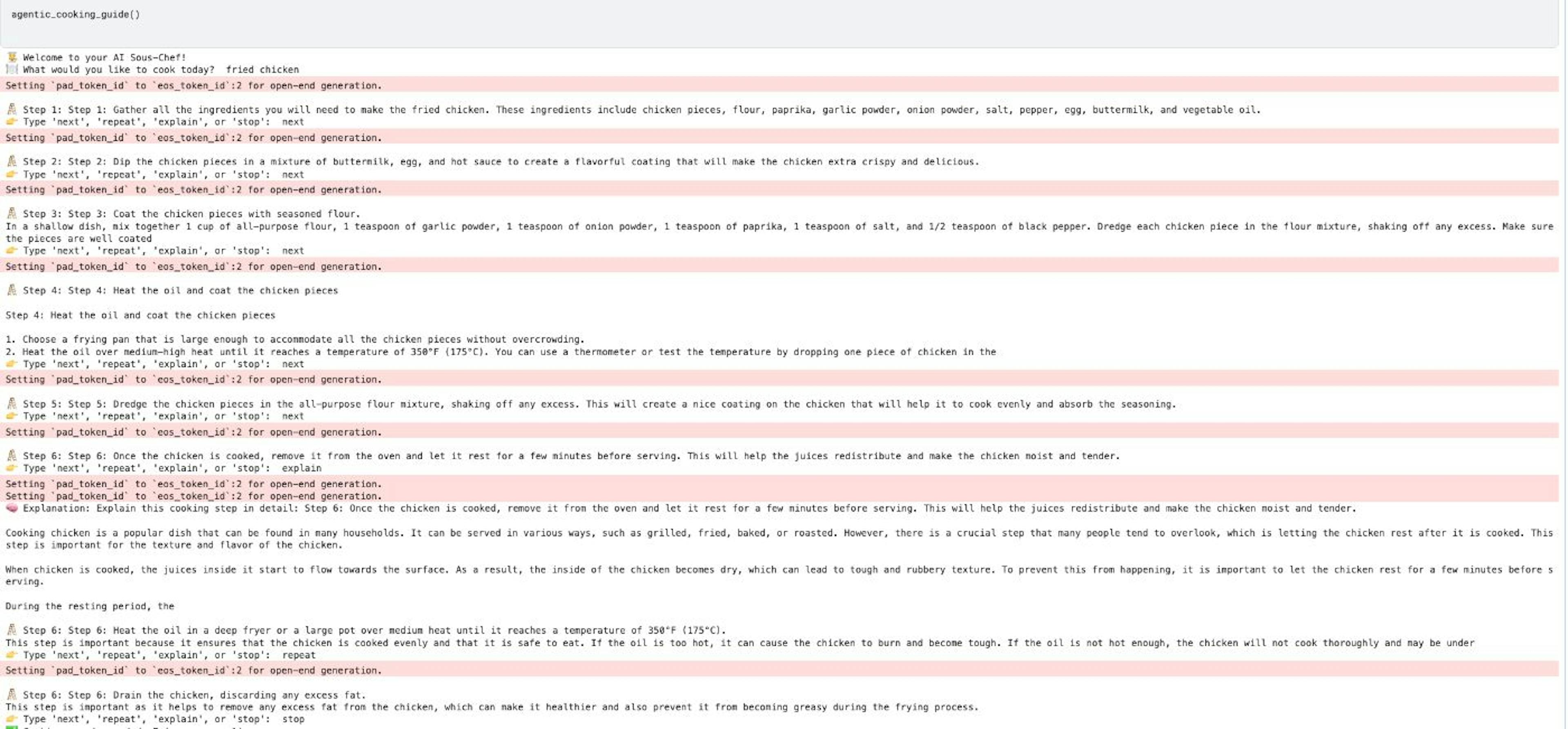 agentic_cooking_guide () 함수는 대화식 AI Cooking Assistant를 시작하는 진입 점 역할을합니다. 그것은 사용자와의 단계별 대화 세션을 시작하여지지적인 sous-chef와 같은 레시피를 안내합니다. 이것을 실행하면 내 출력이 아래에서 보입니다.