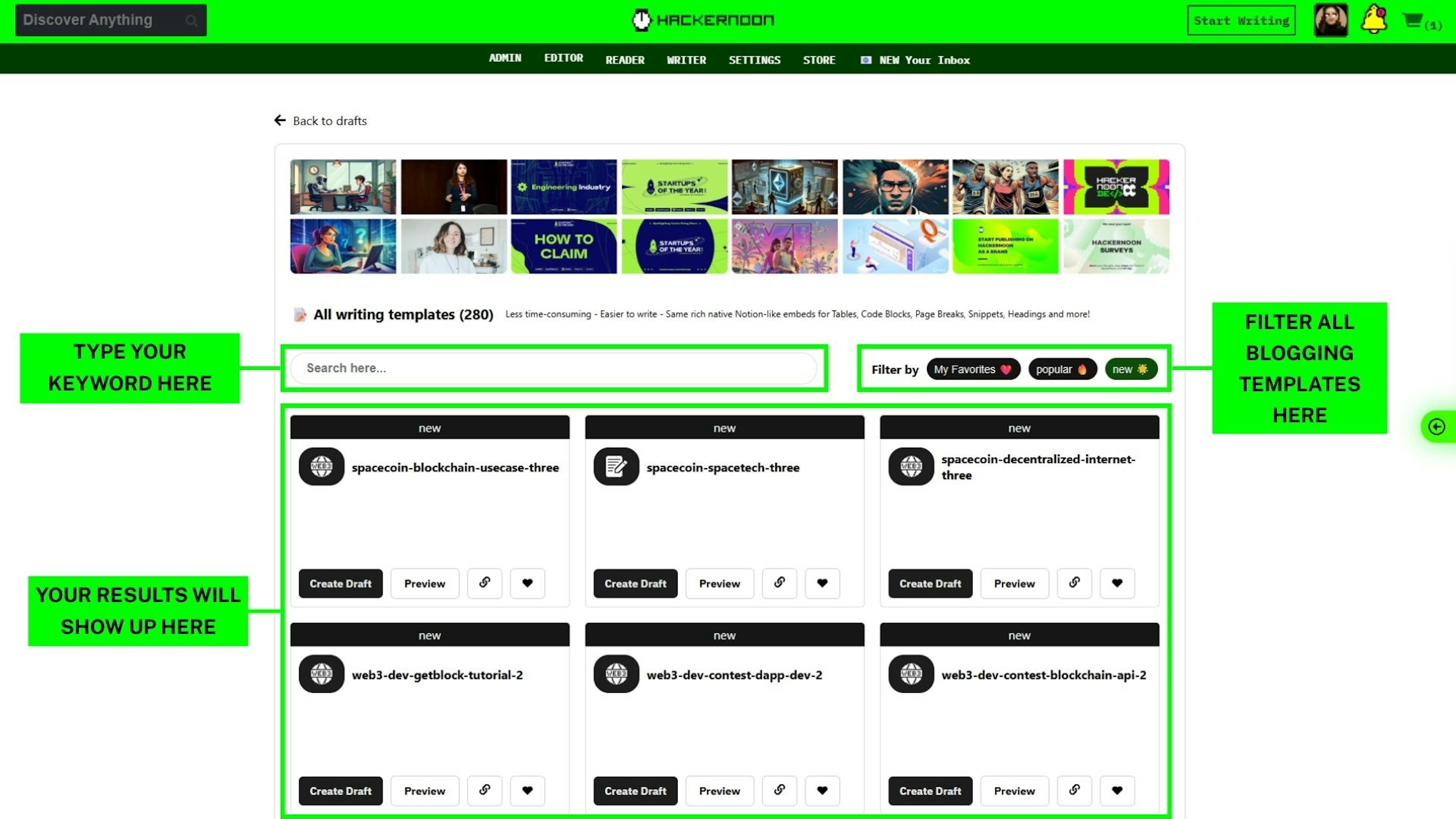 템플릿을 찾아 볼 수 있습니다 즐겨 찾기,,, 새로운또는 인기 있는또는 키워드를 사용하여 검색 – 이전과 마찬가지로. 필터를 클릭하거나 키워드를 입력하여 일치하는 결과를 즉시 확인하십시오.