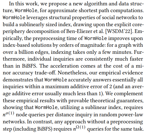 \ 임의의 그래프에 대한 일반적인 솔루션은 아마도 불가능할 것입니다. 그러나 실제 사회 및 정보 네트워크에서는 악용될 수 있는 질서와 구조가 허용됩니다. 이 연구에서 우리는 그러한 네트워크에서 최단 경로 문제의 약간 완화된 버전에 대해 이 질문을 긍정적으로 해결합니다. 대규모 네트워크의 핵심-주변 구조에서 영감을 얻었습니다. [43, 50, 52, 63]우리는 하위 선형 크기의 인덱스를 구성하고 엄격한 하위 선형 정점 하위 집합을 쿼리하여 문의에 응답하는 솔루션을 제공합니다. 특히 우리 솔루션은 전체 네트워크에 접속할 필요가 없습니다. 알고리즘은 근사치 오류가 추가되고 매우 작은(거의 항상 0 또는 1) 근사 최단 경로를 반환합니다. 실제로 설정 시간은 무시할 수 있으며(10억 개의 에지 그래프의 경우 몇 분) 조회 시간은 BiBFS보다 향상됩니다. 또한 기존 인덱스 기반 솔루션과 쉽게 결합하여 조회 시간을 더욱 향상시킬 수 있습니다. 우리는 또한 경험적 성과를 밝히는 이론적 결과를 포함합니다.