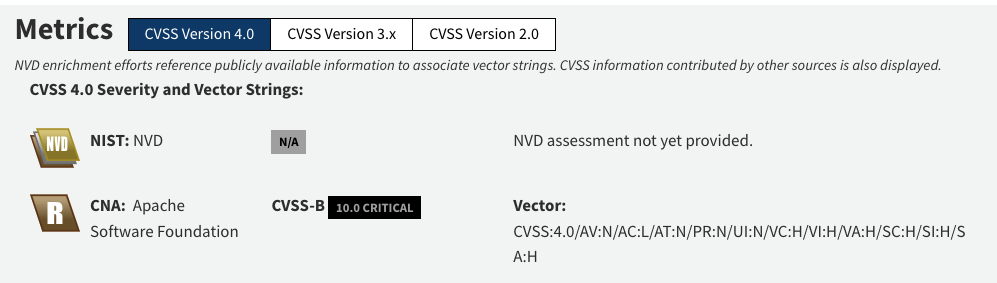 2025 년 4 월 2 일, 이러한 취약점 중 하나가 심각도가 가장 높은 Parquet-Avro 모듈에 대해보고되었습니다 (CVSS 10.0, “Critical”). Parquet-avro 모듈이 Parquet 파일에 내장 된 신뢰할 수없는 스키마를 사로화하면 신뢰할 수없는 데이터의 사제화로 알려진 취약성을 만듭니다 (CWE-502).