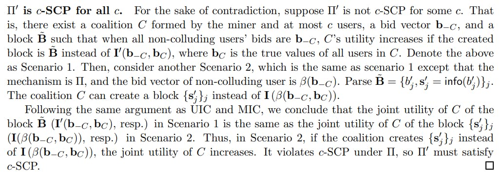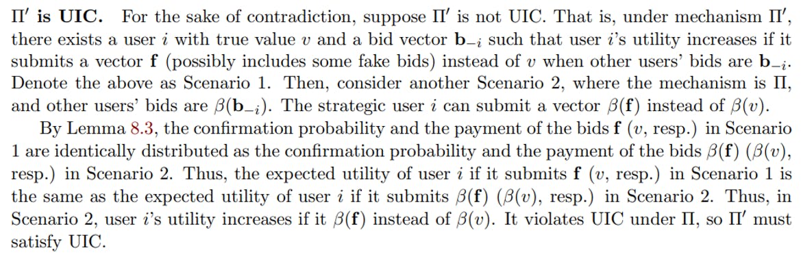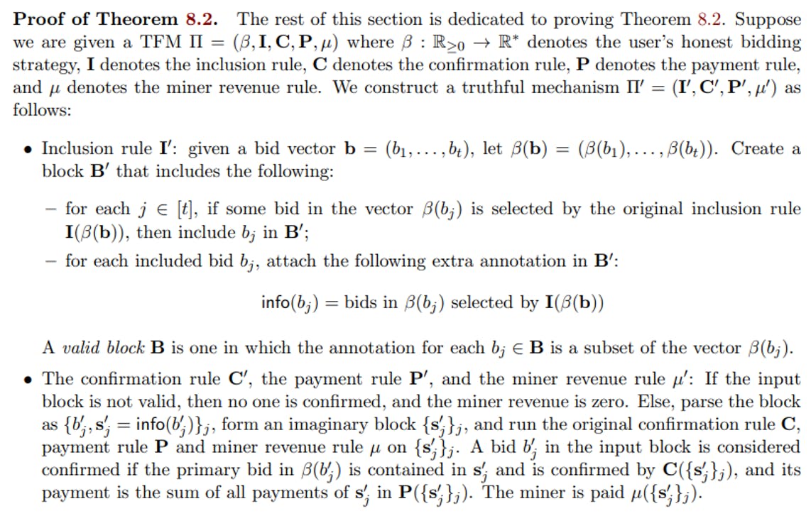 정리 8.2. C를 자연수로하자. 개별적으로 합리적 입찰 규칙을 가진 UIC, MIC 및 C-SCP 인 블록 크기 k에 대한 비 진실 TFM π를 고려할 때, UIC, MIC 및 C-SCP 인 블록 크기 k에 대한 진실한 TFM π ‘가 존재합니다. 1) 정직한 입찰 규칙이 진실한 값의 벡터와 2) 정직하게 분배되는 정직한 결과는 정직하게 분포되어 있습니다. π ‘.