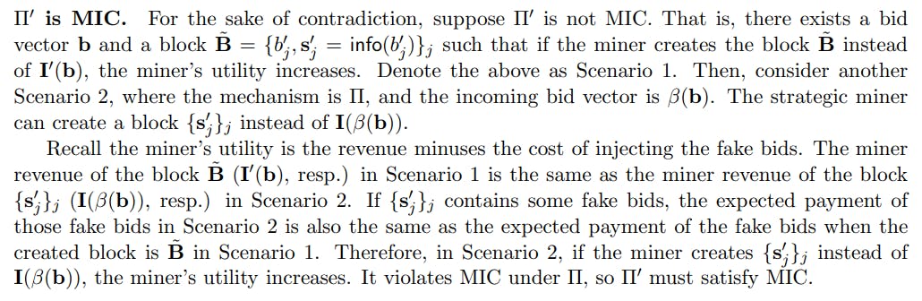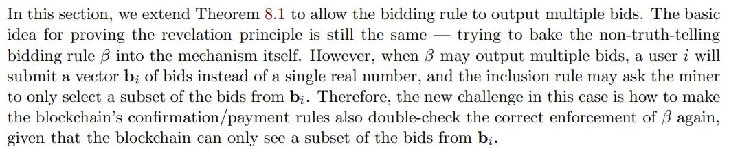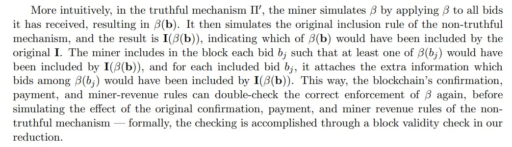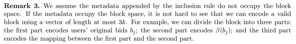 이 어려움을 처리하려면 포함 규칙의 구문을 완화해야합니다. 우리의 정의의 앞부분 (섹션 2.1)에서 포함 규칙이 입력 입찰 벡터의 하위 집합을 출력해야합니다. 이 섹션에서는이 구문 요구 사항을 약간 긴장시키고 정직한 포함 규칙이 각 입찰에 대한 메타 데이터를 추가 할 수 있도록합니다.[11] 정직한 실행에서 메타 데이터의 목적은 블록 체인의 확인/지불 규칙에 대한 보조 정보를 인코딩하는 것입니다. 구문의 이러한 완화는 본 백서에서 불가능한 결과에 대해 필수적이지 않습니다. 정직한 포함 규칙이 메타 데이터를 추가 할 수 있더라도 불가능한 결과 (섹션 4, 5 및 6.2)에 대한 모든 증거가 여전히 유지되기 때문입니다. 이제 우리는 요한 계시록 원칙을 제시 할 준비가되었습니다.