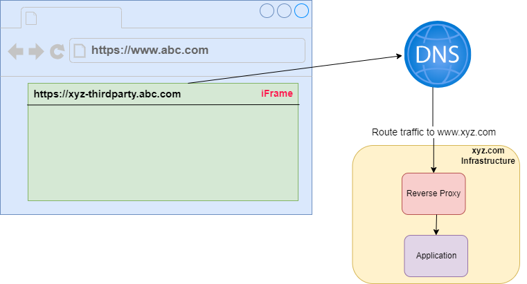 - 이렇게하면 쿠키가 발행되었습니다www.xyz.com실제로 Alias Record xyz-thirdpary.abc.com에 따라 발행됩니다. 쿠키의 도메인은 브라우저 주소 바 (www.abc.com)에있는 URL의 도메인과 일치하는 abc.com이므로 쿠키는 첫 번째 파티로 취급됩니다. iframe을 사용한 응용 프로그램은 Safari 및 Chrome Incognito 모드에서 작동합니다.